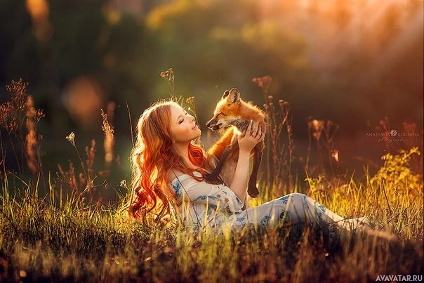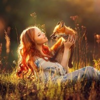 a young woman with red hair who appears to be smiling as she holds a small fox in her lap. The setting seems to be a natural outdoor environment during what could be
