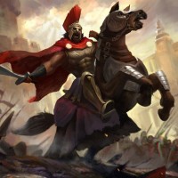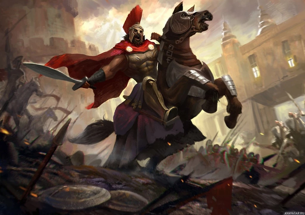 На картинке изображен воин верхом, предполагая, что он всадник и, возможно, участвует в бою. Фон хаотичен с дымом, что указывает на сцену битвы. Стиль изображения имеет фантазию или историческое ощущение, потенциально напоминающее сцены из древних времен или мифологические истории.