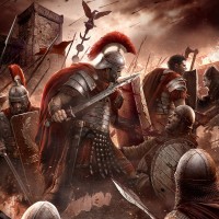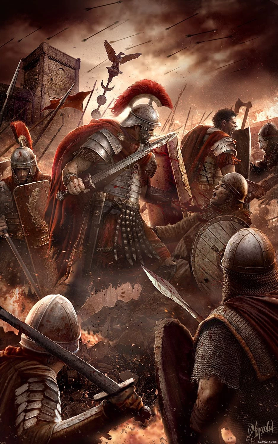 a red cape and holding a sword, which suggests he might be a military leader or a warrior of high rank. Surrounding him are other warriors engaged in combat, some wielding swords and others wearing shields. The art style conveys a sense of chaos and intensity, with figures in the foreground appearing more detailed than those further back, which adds to