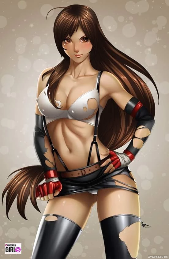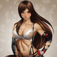 female character, likely from an animated show or video game. She is wearing revealing attire that includes a bustier and leotard with a muscular design, suggesting she might be a combat-