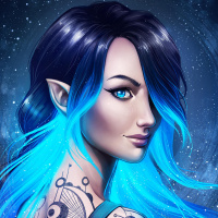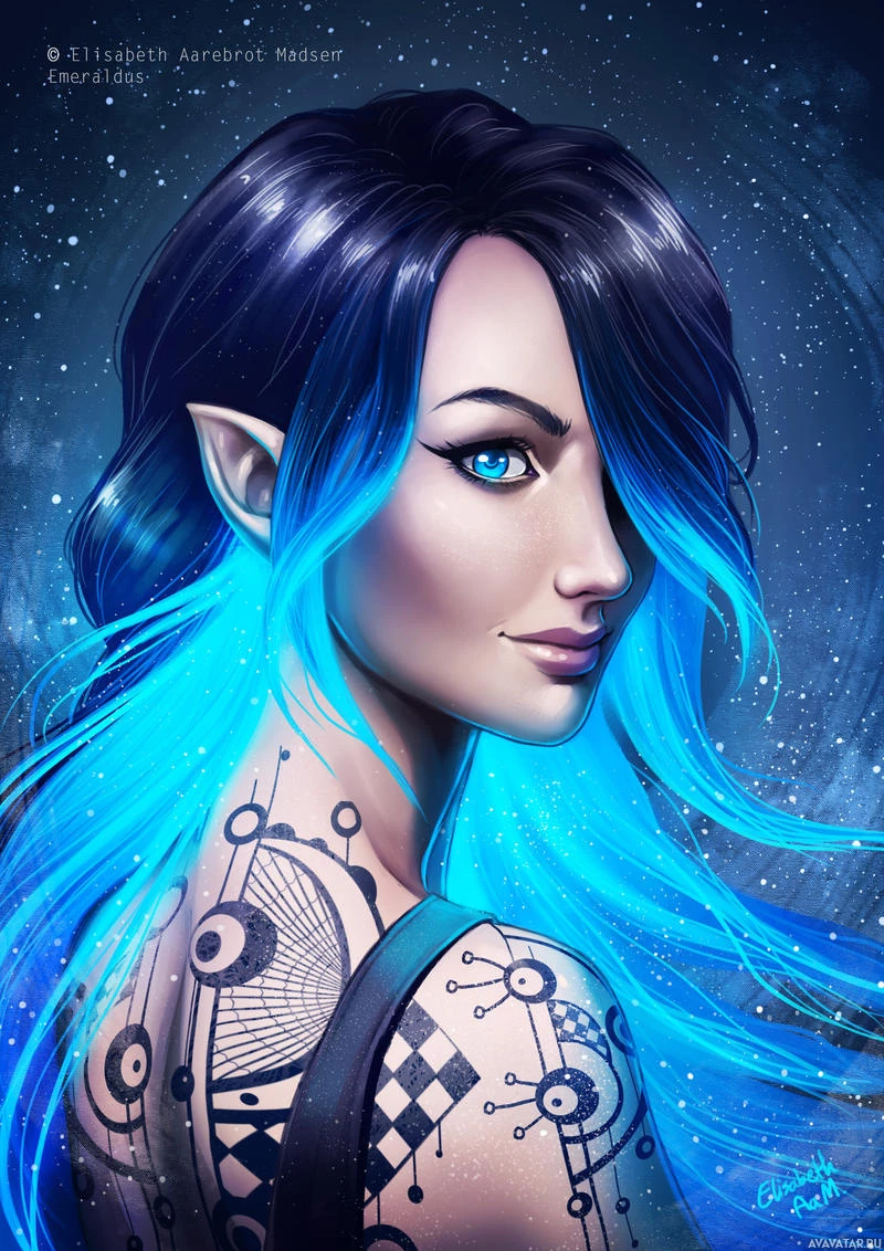 blue hair and her eyes have a glowing effect, suggesting a fantasy or magical theme. The character is depicted from behind and has tattoos visible on her arms. There are also elements in the background that look like stars, contributing to
