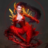 an action pose, wielding what looks like a staff or trident with her right hand. The background is dark and moody, which contrasts with the vibrant red of the character, drawing attention to her as