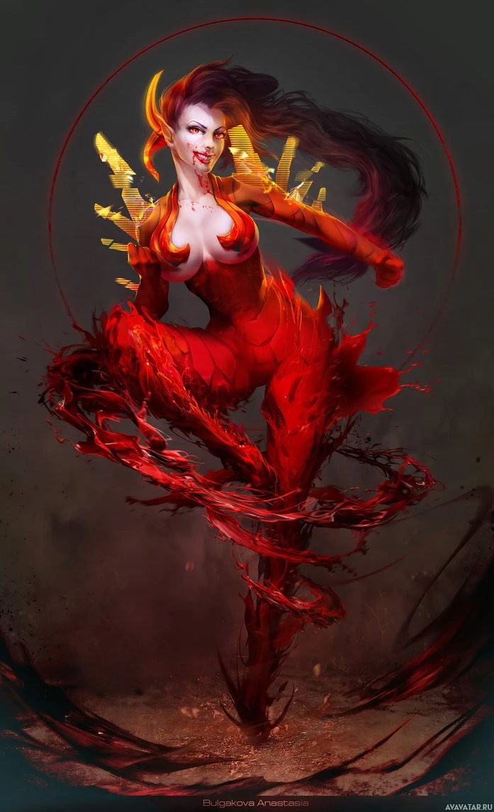 red hair and is wearing a red outfit that resembles fish scales or armor, suggesting a mermaid-like appearance. She has a tail that could imply she is half human, half