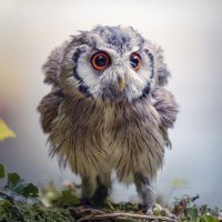 The image shows an owl perched on a branch, looking directly at the camera with its eyes wide open. It appears to be sitting in a natural environment surrounded by foliage and moss. The owl is not a girl or a dog; it's a bird commonly known for its distinctive appearance.