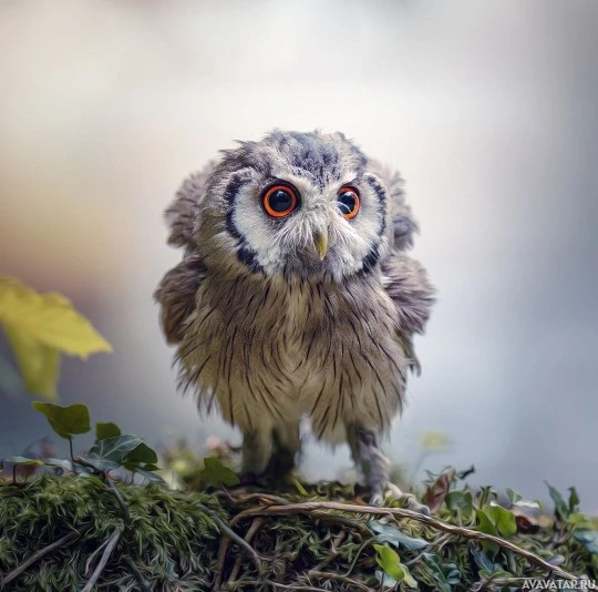 На снимке изображена сова, сидящая на ветке, глядя прямо в камеру с широко открытыми глазами. Похоже, что он сидит в естественной среде, окруженной листвой и мхом. Сова - это не девочка или собака; это птица, широко известная своей отличительной внешностью.
