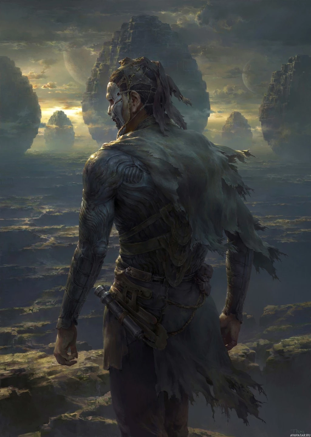 a fantasy scene featuring a character standing on what appears to be the edge of a cliff or platform. The character is wearing tattered clothes and has a mask covering their face, which gives them