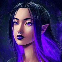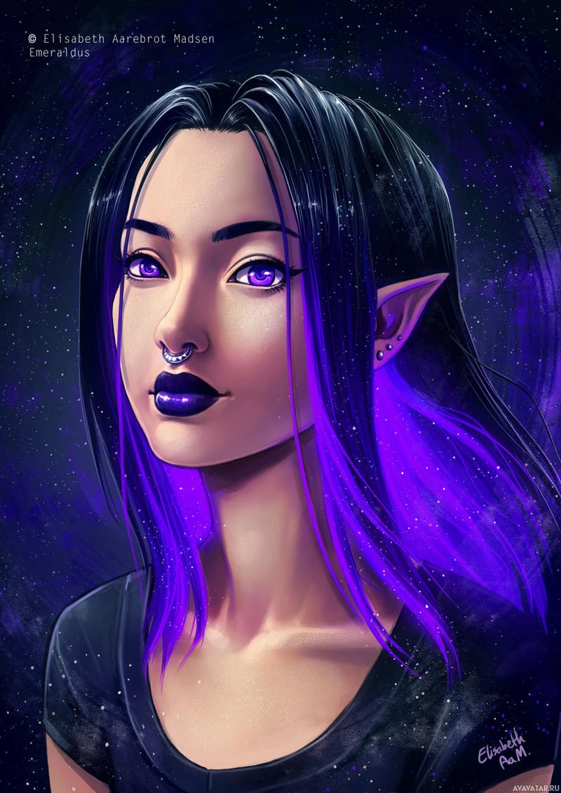 purple hair and some visible features that suggest she might have otherworldly or magical qualities, such as pointed ears. She has