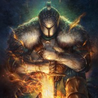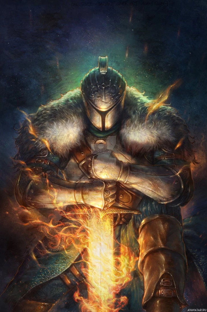 an armored knight with a helmet, holding a sword and shield, standing in front of what appears to be fire or flames. The character is styled in