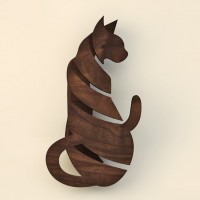 wooden sculpture of a cat. The cat appears to be curled up in a relaxed position, with its head resting on its