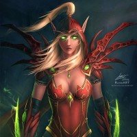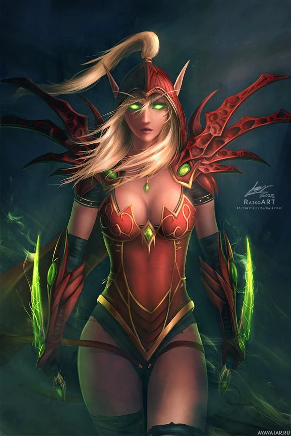 red armor with gold accents, and she has green energy emanating from her hand or fingertips, indicating some sort of magical power or ability. The background is dark and ominous, possibly suggesting a battlefield or
