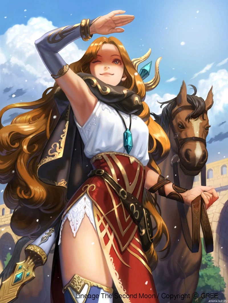 the reins of a horse, suggesting she is mounted on it. The background indicates a setting inspired by