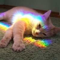 The image shows a cat lying down on what appears to be a carpeted floor. There is an unusual light effect that illuminates the cat and the surrounding area, giving it the appearance of rainbow or multicolored light. This could be due to a lighting setup or some other form of photographic manipulation. The cat seems relaxed in its environment.