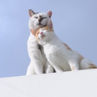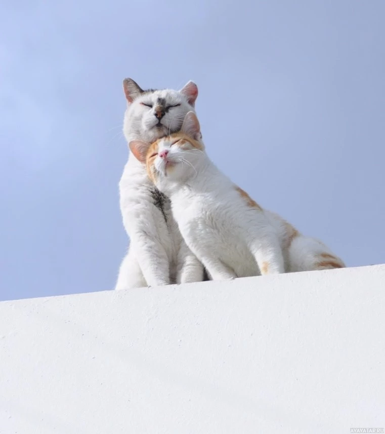The image shows two cats sitting closely together, appearing to be in
