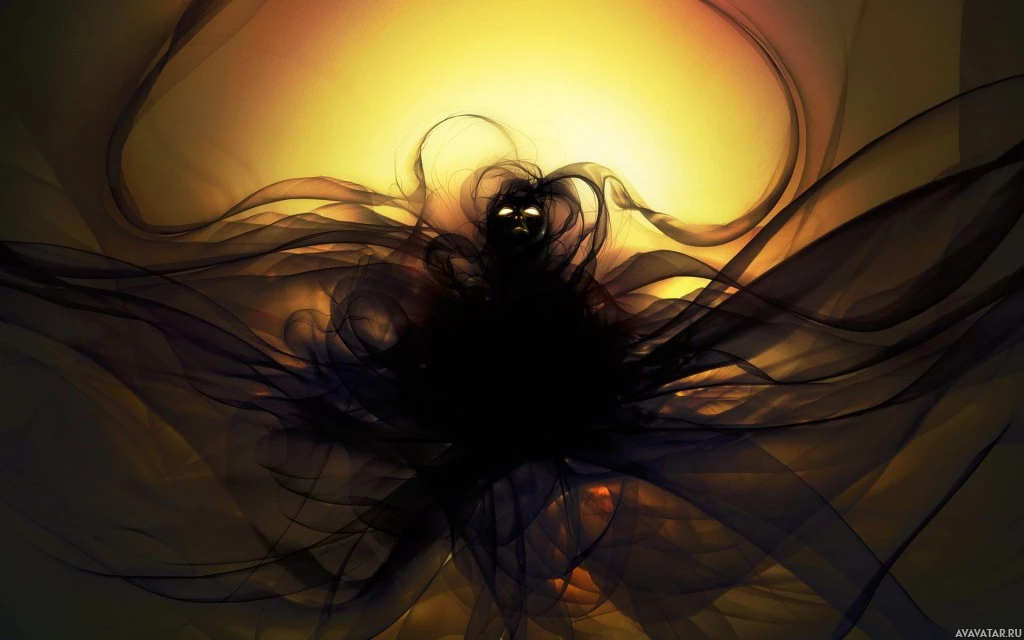 long hair and seems to be wearing dark clothing that blends into the background, creating a sense of mystery and supernatural presence. In the background, there's a golden sun-like illumination emanating from what appears to be