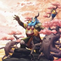 magical abilities. The Prophet stands on a platform surrounded by cherry blossom trees that are blooming with