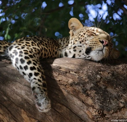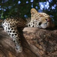 a tree branch. The animal appears to be asleep or at least in a state of relaxation, with its eyes closed and body comfortably stretched out along