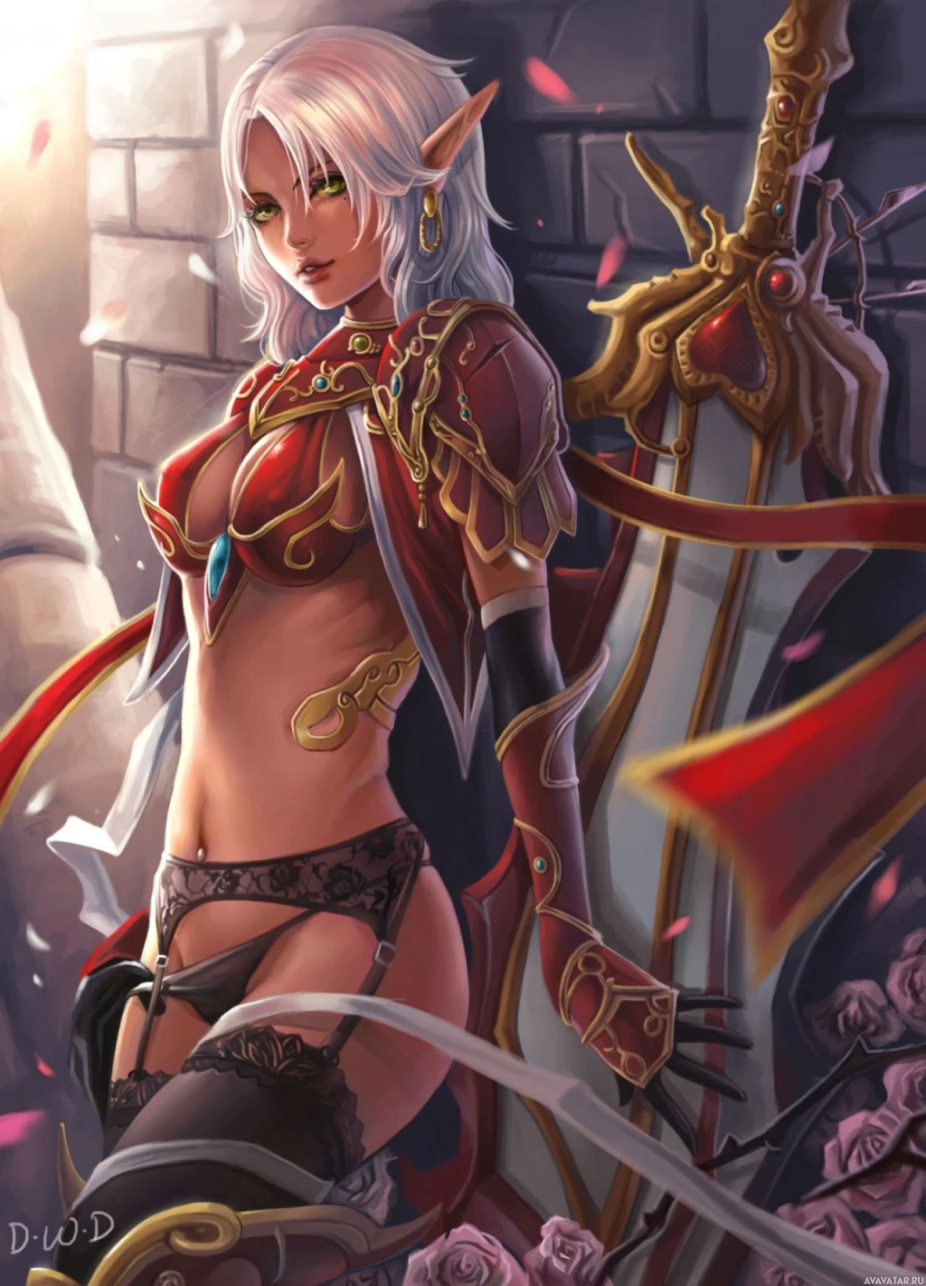 white hair. She is wearing a red and gold armor, suggesting that she might be a warrior or a fighter of some sort. There are rose petals scattered around her feet, indicating a setting that could be romantic or special in nature. The character has an enigmatic expression on her face, which could imply that she is a skilled or powerful figure in