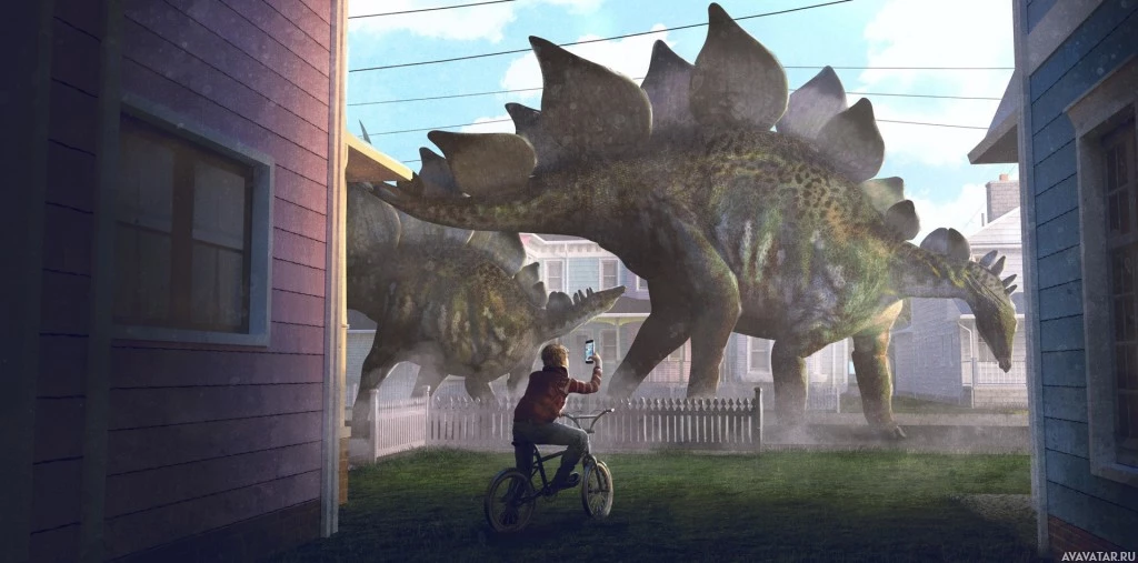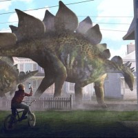 a surreal scene where several large dinosaurs, including one that appears to be a Tyrannosaurus Rex, are standing in the yard of a residential house. A person is sitting on a bicycle in front of the house, looking at the dinosaurs with