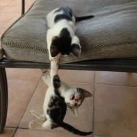 playful behavior typical of young felines, which often involves jumping, climbing, and chasing each other. The setting appears to be
