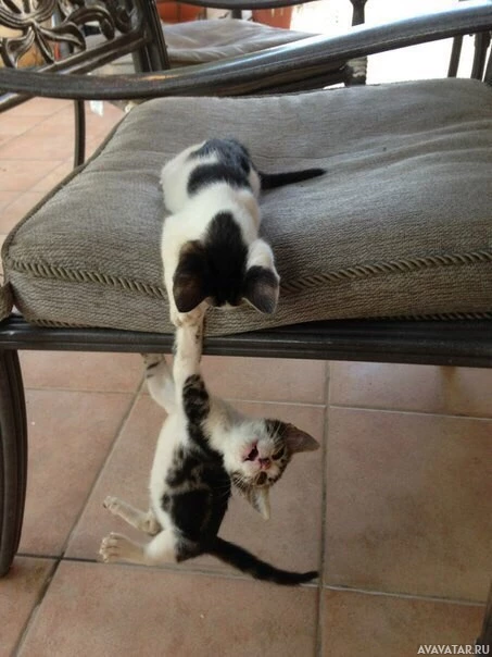 The image shows two kittens playing together. One kitten is on