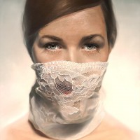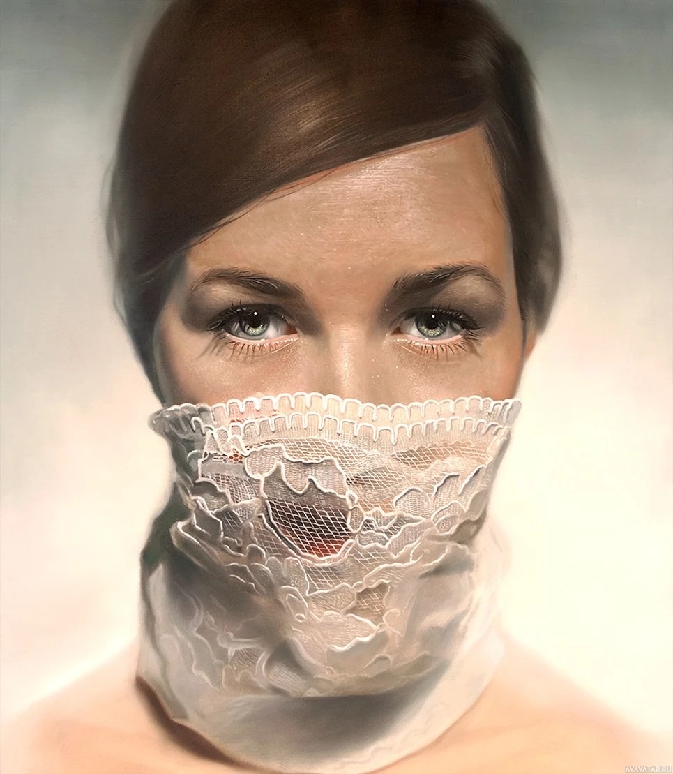 a young woman. Her gaze is directed straight at the viewer, and she has a thoughtful or contemplative expression on her face. She's wearing a white lace garment that appears to be draped around her neck and shoulders, with only a portion visible above her mouth. The art style of the painting gives it an impressionistic quality. Her eyes are accentuated by