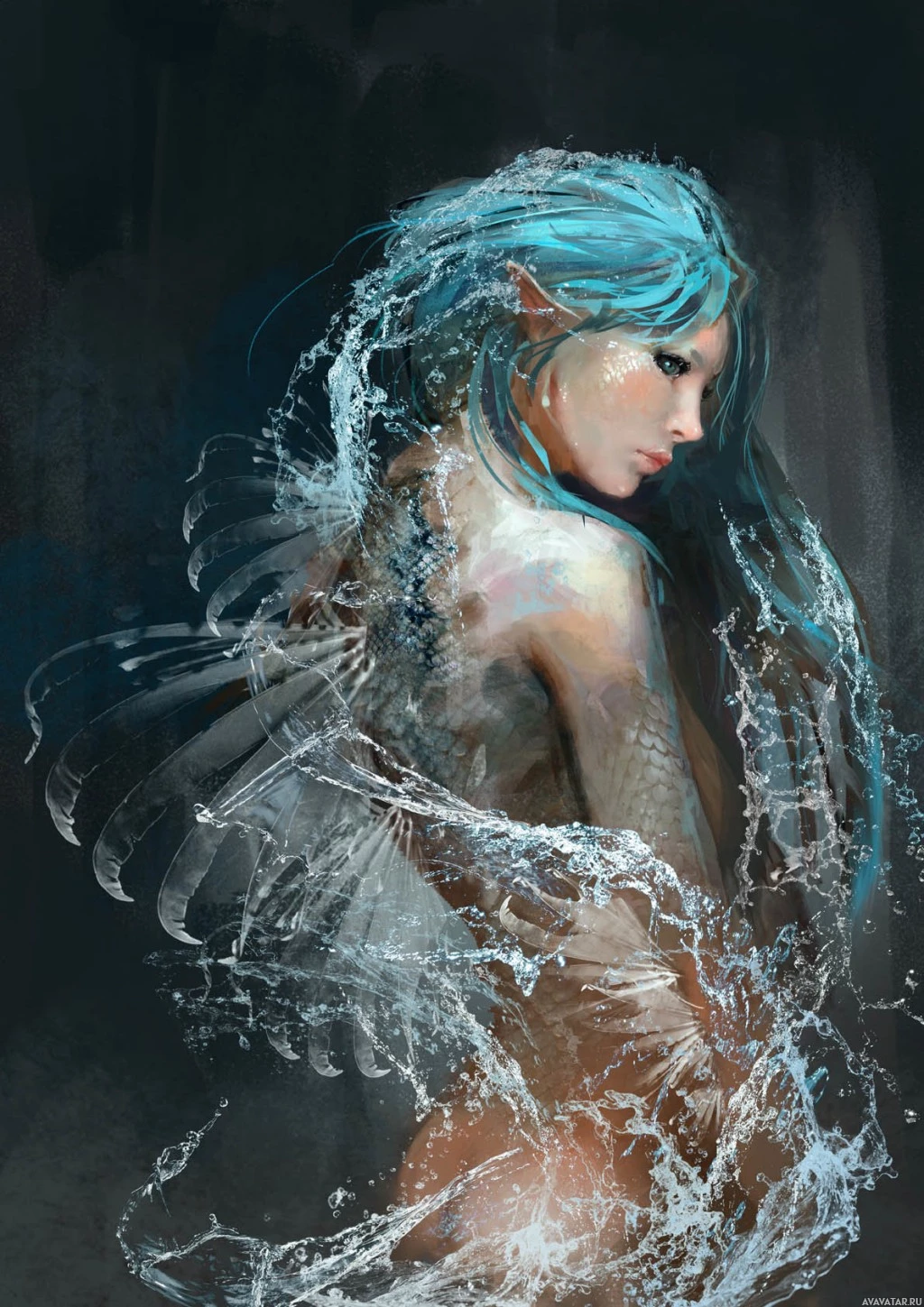 blue hair, depicted from behind. She is described as a mermaid with her tail flowing around her like water, suggesting she might have the upper