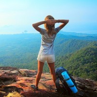 outdoor attire and has her hands raised near her head, possibly shielding from the sun or enjoying the view. There's a backpack nearby, suggesting she might be on a hike or
