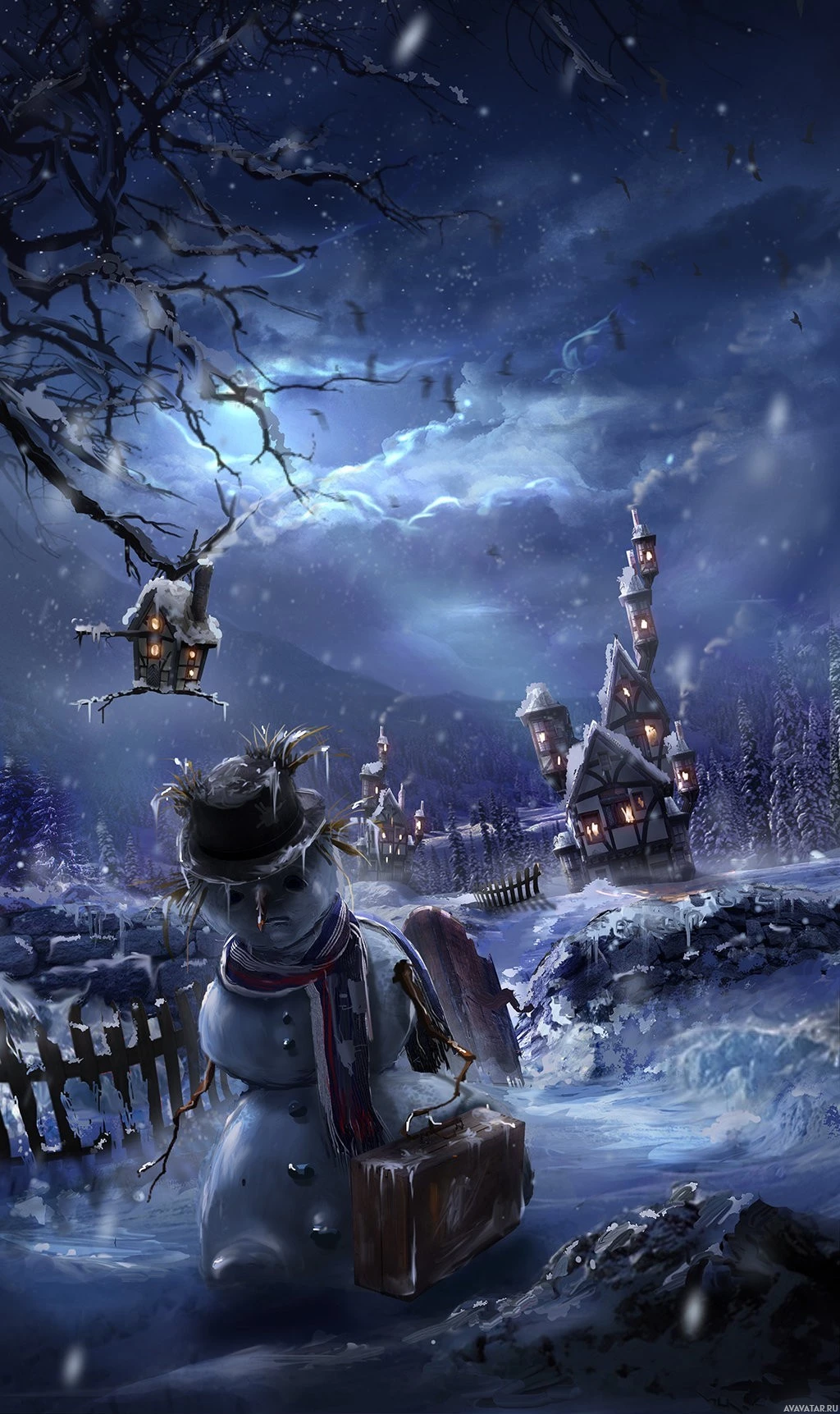 a winter scene at night with the moon visible in the sky. A snowman is sitting on the ground next to
