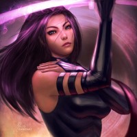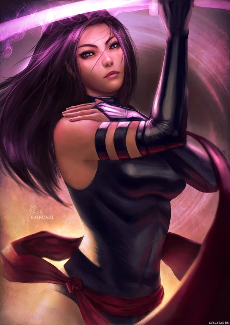 purple hair and is wearing a black armored suit with what looks like energy or magical markings on it. In her right hand, she's holding a sword. There's also