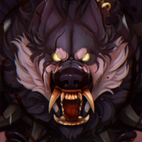 a fantasy werewolf. The creature has the head of a wolf with sharp teeth and