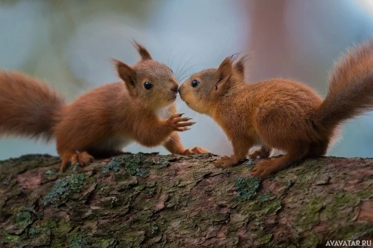 a tree branch. They appear to be facing each other, and one of the squirrels seems to be in a playful or confrontational posture, with its paws raised as if it's holding onto something or about to shake the other squirrel. The setting looks like an outdoor