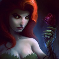The image features a character with red hair and green skin, who is known as Poison Ivy. She is holding a rose in her hand. Her attire appears to be inspired by the DC Comics villainess she's based on.