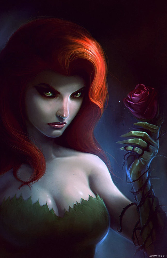 На картинке изображен персонаж с рыжими волосами и зеленой кожей, который известен как Ядовитый плющ. Она держит в руке розу. Ее наряд, кажется, вдохновлен злодейством DC Comics, на котором она основана.
