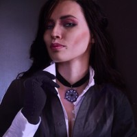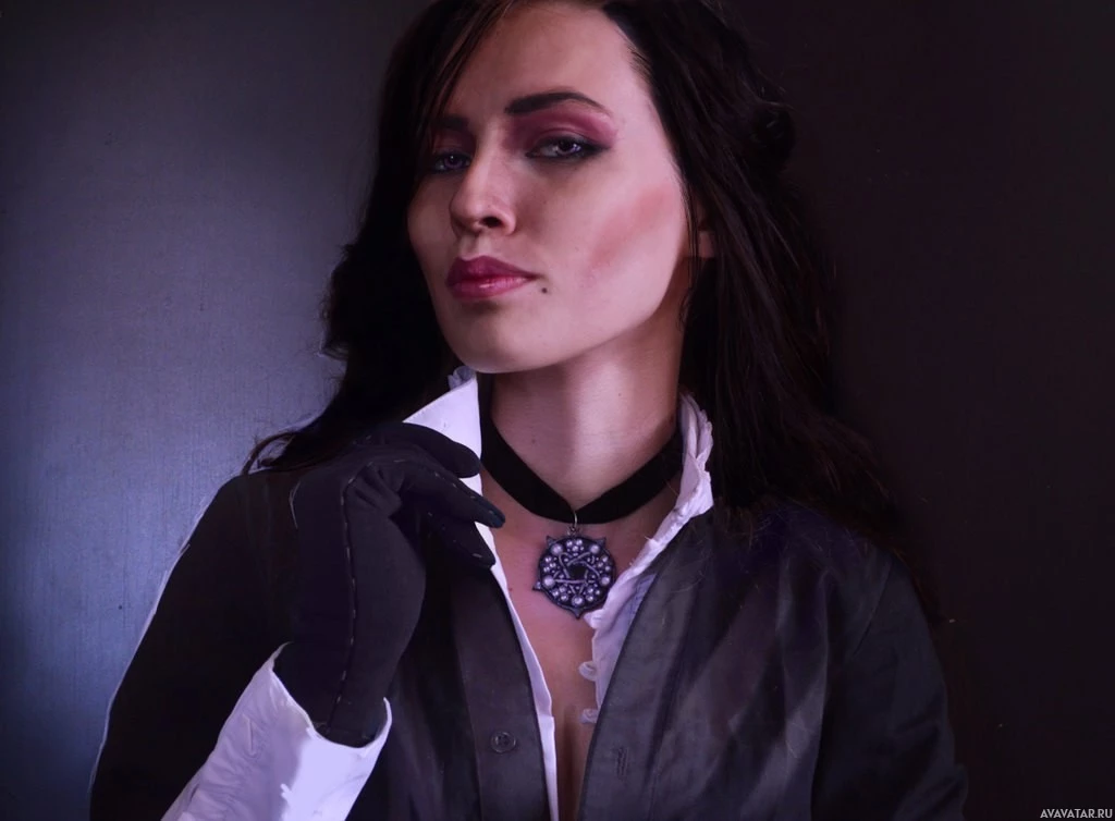 The image shows a person posing in what appears to be an outfit that resembles the attire of Yennefer from "The Witcher"