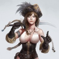 a female character depicted in an illustrative style. She is dressed as a pirate, wearing a tricorne hat with a feather, a jacket, and a pair of boots that resemble typical