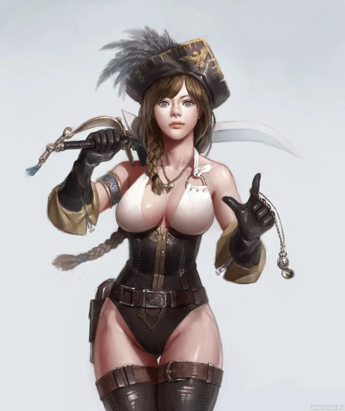 pirate attire. In her right hand, she holds a cutlass, which is a type of sword traditionally used by pirates. Her left hand points towards the viewer, and she has