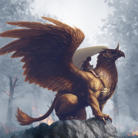 a natural setting that could be a forest, indicated by the presence of trees and a misty atmosphere. The griffon is presented with