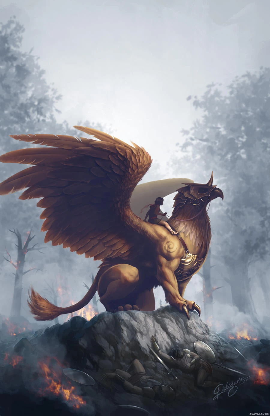 a mythical creature with the body of a lion and the head and wings of an eagle. This