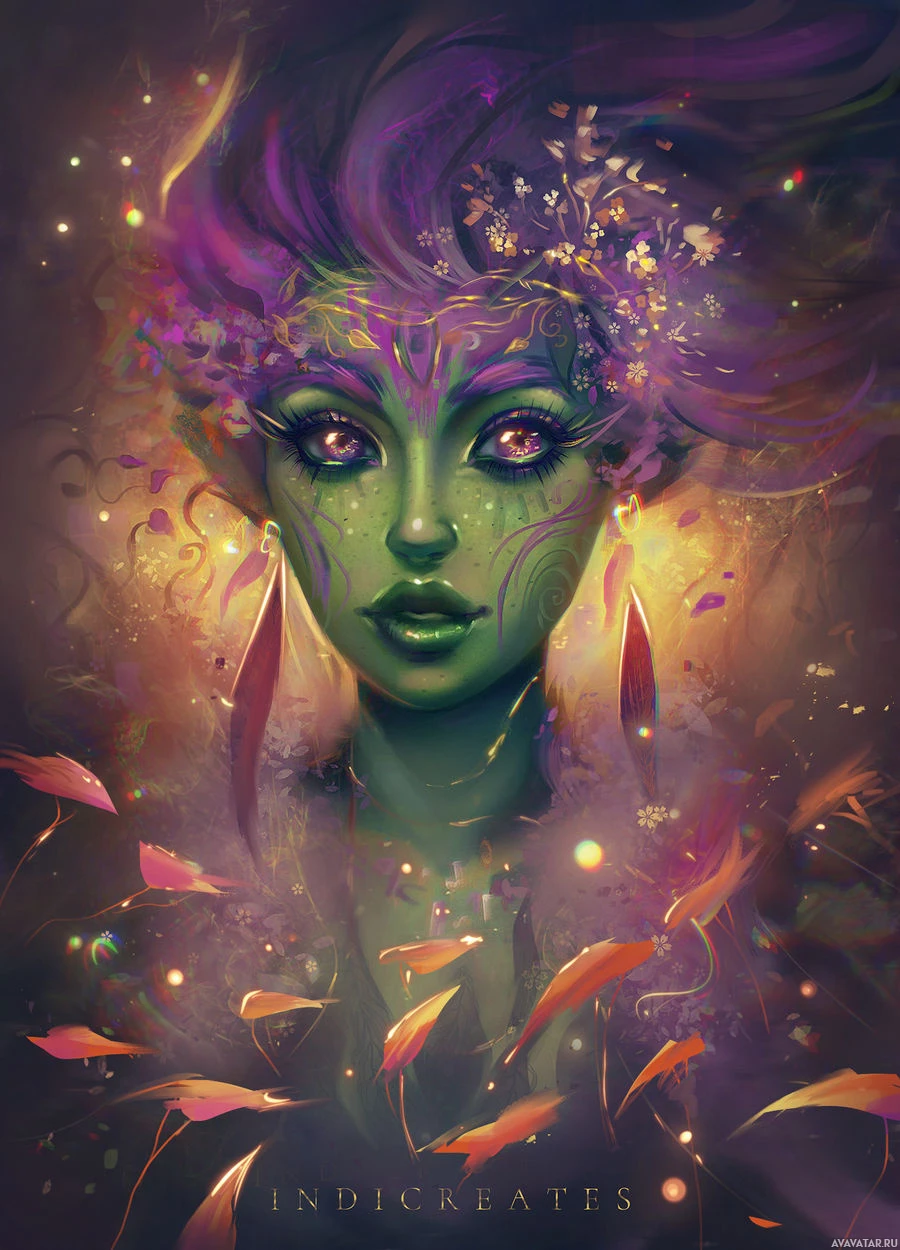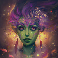 the impression of a connection to nature or magic. The color palette is rich and vibrant, with shades of purple, green, and hints of yellow contributing to an ethereal and enchanting atmosphere. The artwork conveys a sense of wonder and fantasy that could be associated with a character from a story or