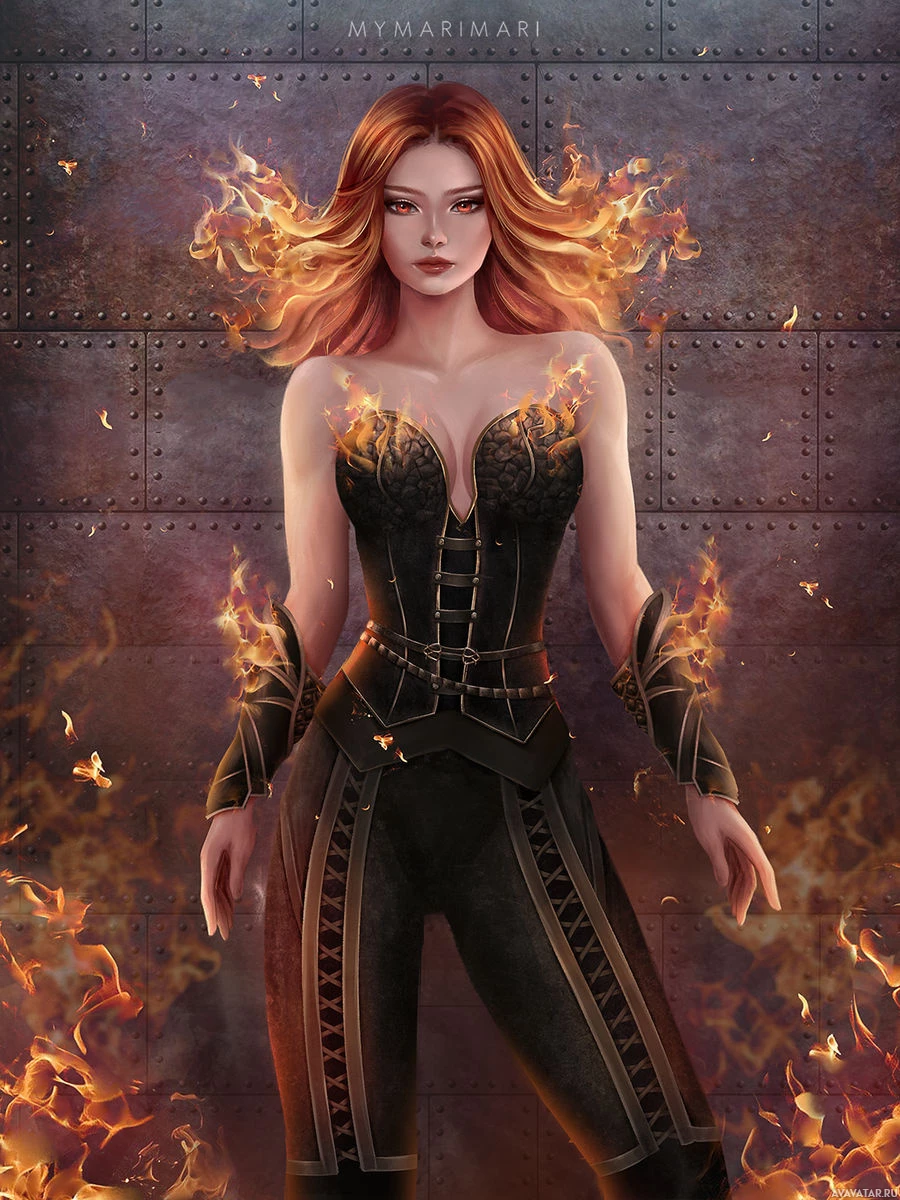 a metallic look with rivets and piping, which gives it a gritty appearance. Flames are seen surrounding her body, adding
