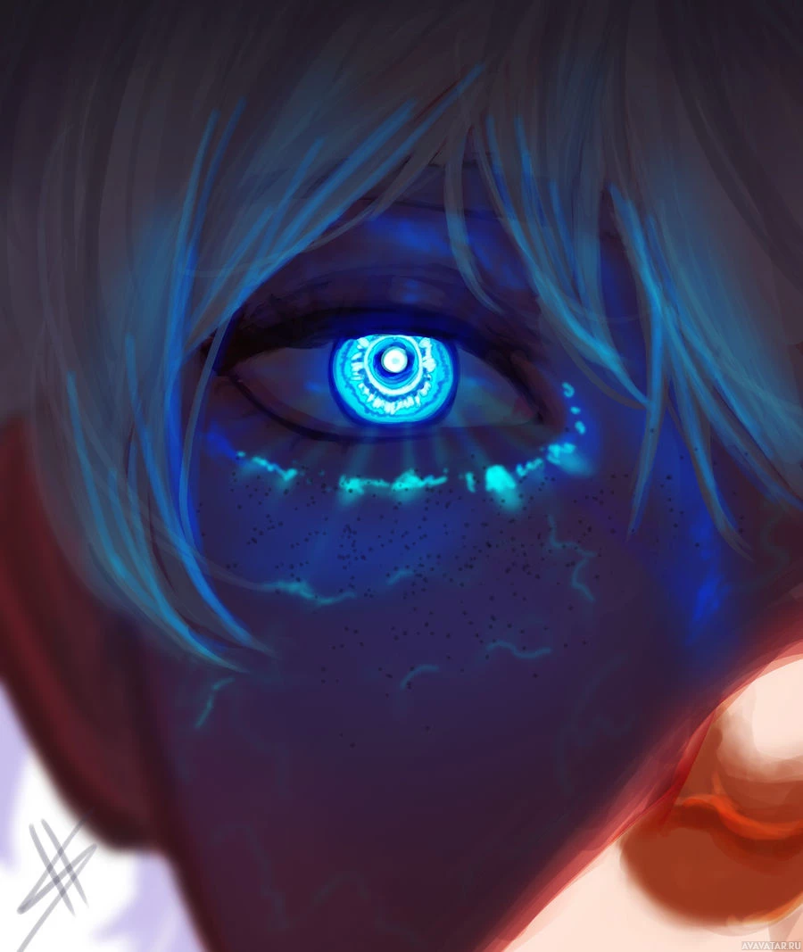 an animated character with blue hair and an eye that has a large, glowing blue orb within it. The character appears to be drawn in a style reminiscent of Japanese animation, commonly known as anime. There are also some small