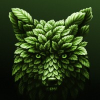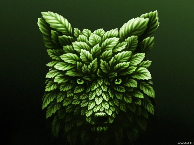 front paws are visible, while its body and back legs are concealed by the foliage. This gives it a green and leafy appearance, as if the fox were part of
