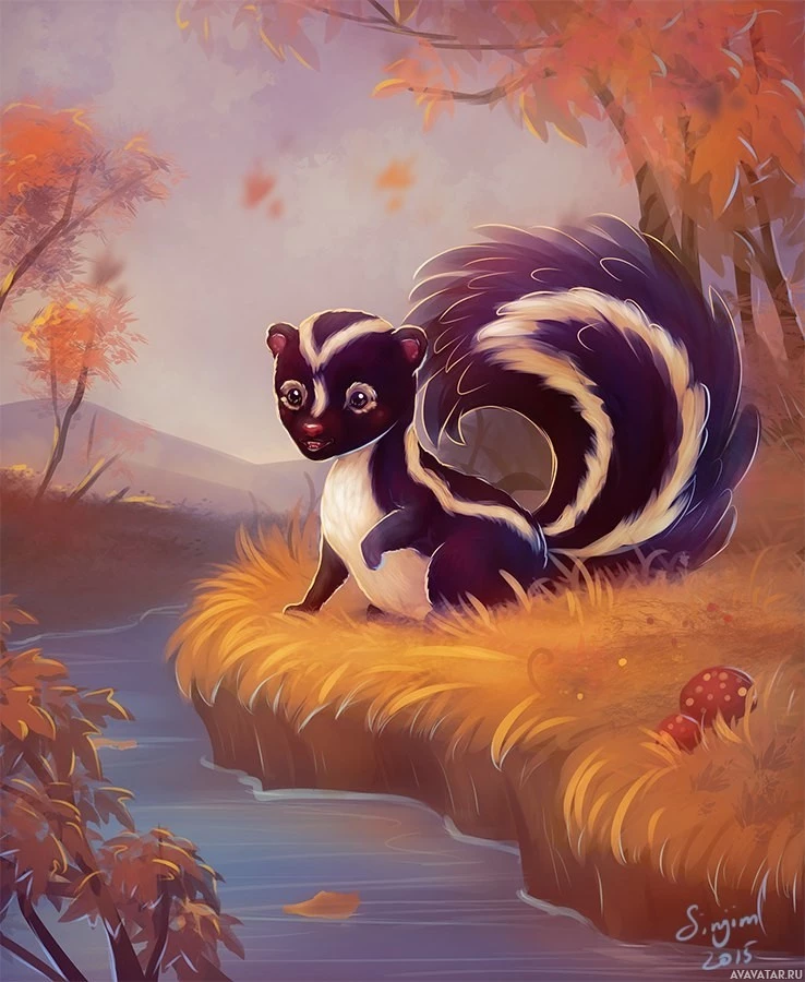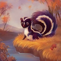 animated character that resembles an ermine or weasel. It is standing on what appears to be the edge of a riverbank or pond in an autumnal setting with