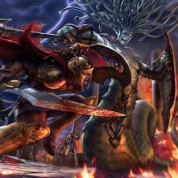 menacing expression, pointed teeth, and serpentine features. The background suggests a chaotic battlefield or ruins, indicating a scene of conflict in