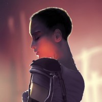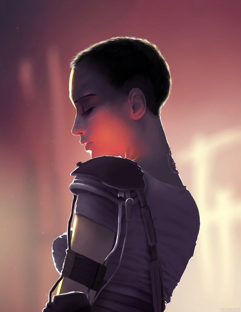 a leather outfit, which is part of her iconic look. Her posture suggests she might be in a contemplative or serious mood. The color palette is dominated by