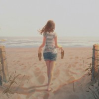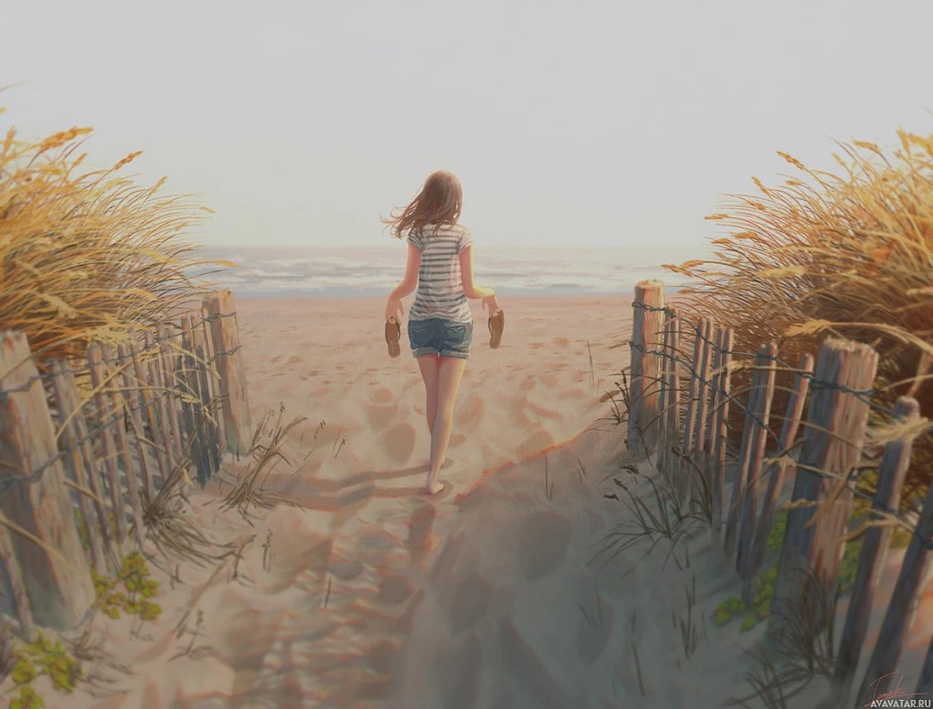 a wooden fence on the left side of the path she is walking on, which is typical for beaches to protect dunes or sand from erosion. The setting looks like it could be