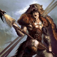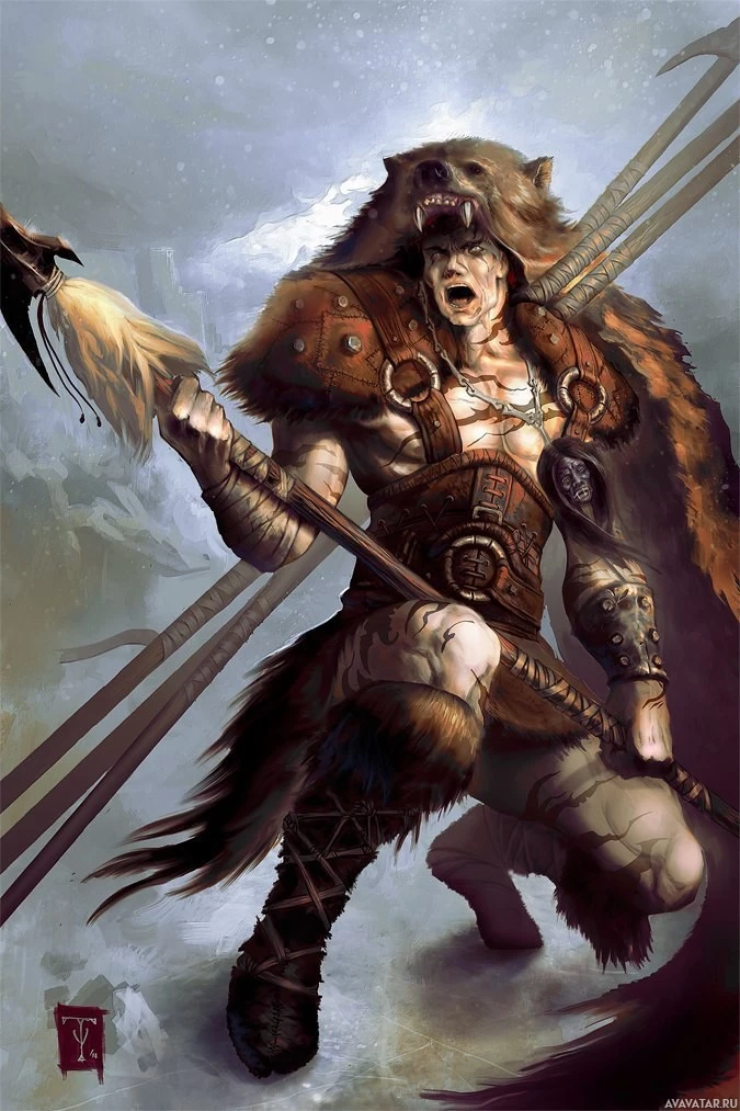 long hair and a beard, adding to the wild and fierce appearance. His expression is intense and determined, which fits well with his menacing and battle-ready posture.