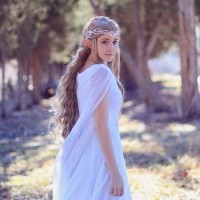 long hair styled to resemble Galadriel's character. The background suggests a natural