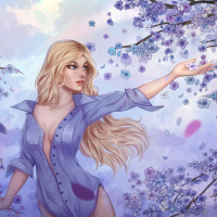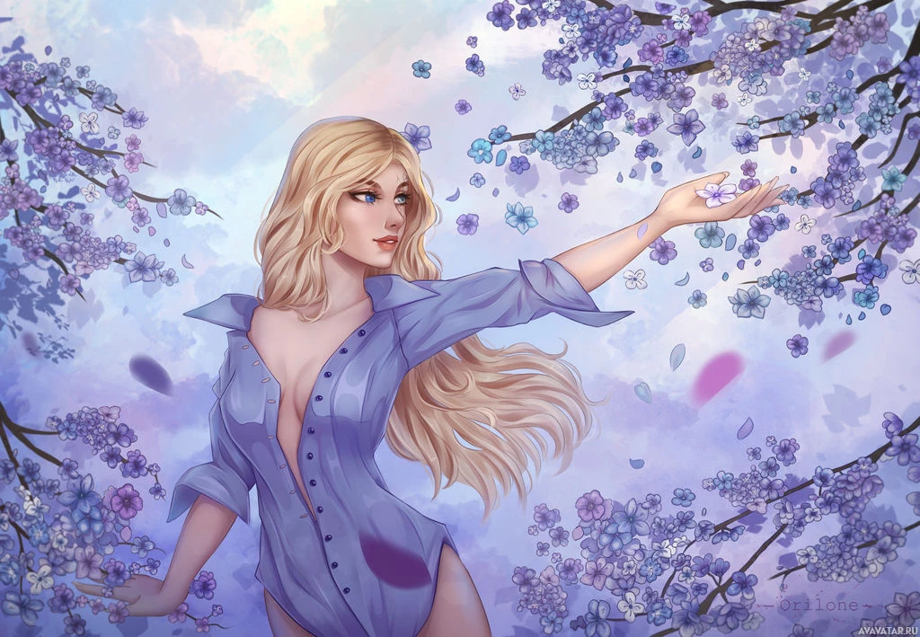 a young woman with blonde hair, wearing a light purple or blue shirt. She has one hand raised to her head as if she's holding onto something or perhaps enjoying the feeling of her hair being blown by the wind. The background is filled with cherry