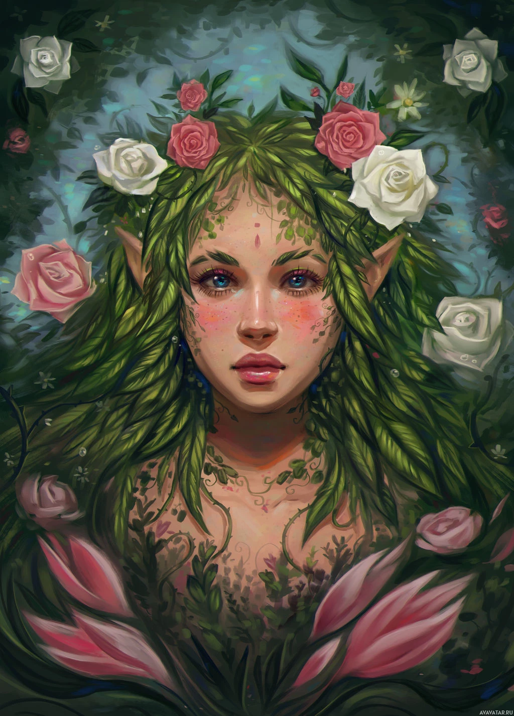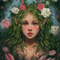 a fantasy art style portrait of an elf or dryad, which is a mythical being often associated with trees and woodland. This figure has pointed ears typical of elves and greenery adorning its head and shoulders, suggesting a connection to nature. It is surrounded by roses,